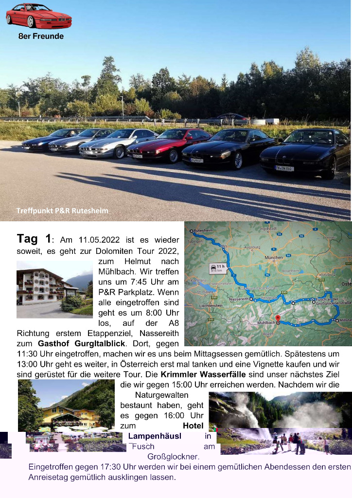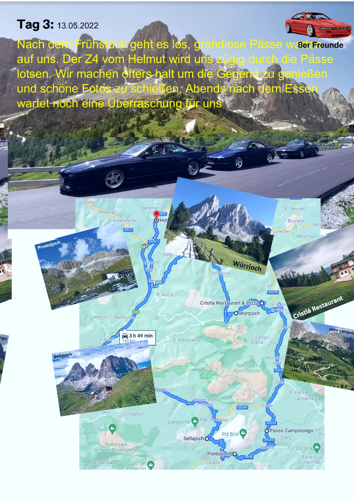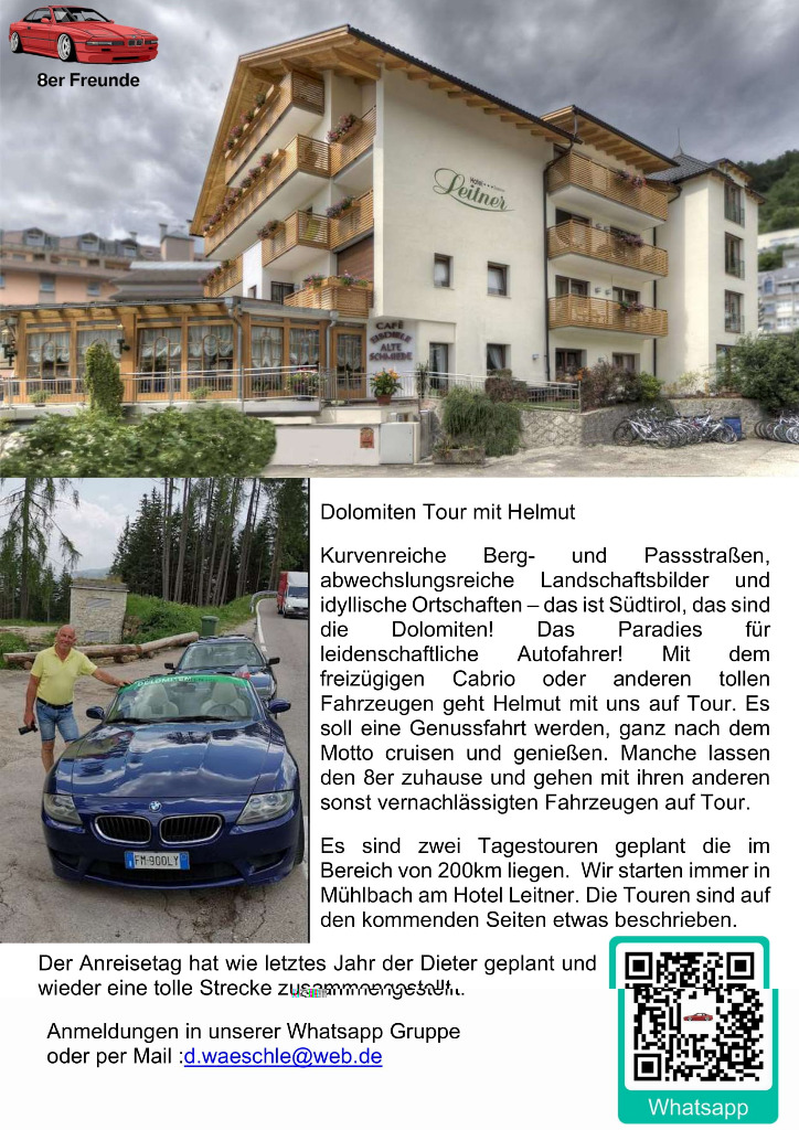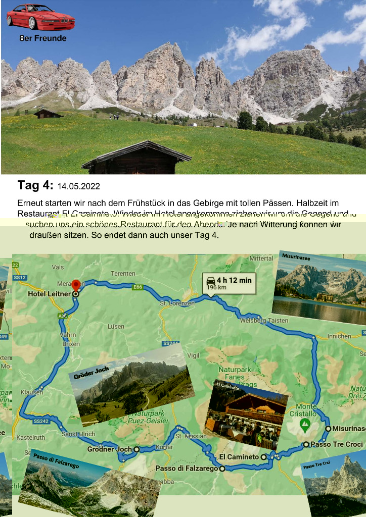 unsere Planung für die Dolomiten Tour 2022 ist fertig. Wer mit mag, einfach melden. Egal mit welchem Auto. wir haben diesesmal den Schwerpunkt Cabrio's... Auch ist die Tour auf max. 10 Fahrzeuge geplant. Soviele Zimmer sind halt geblockt. Sollten es mehr werden, versuchen wir nachzubuchen. Es wird sich dan schon eine Lösung finden...