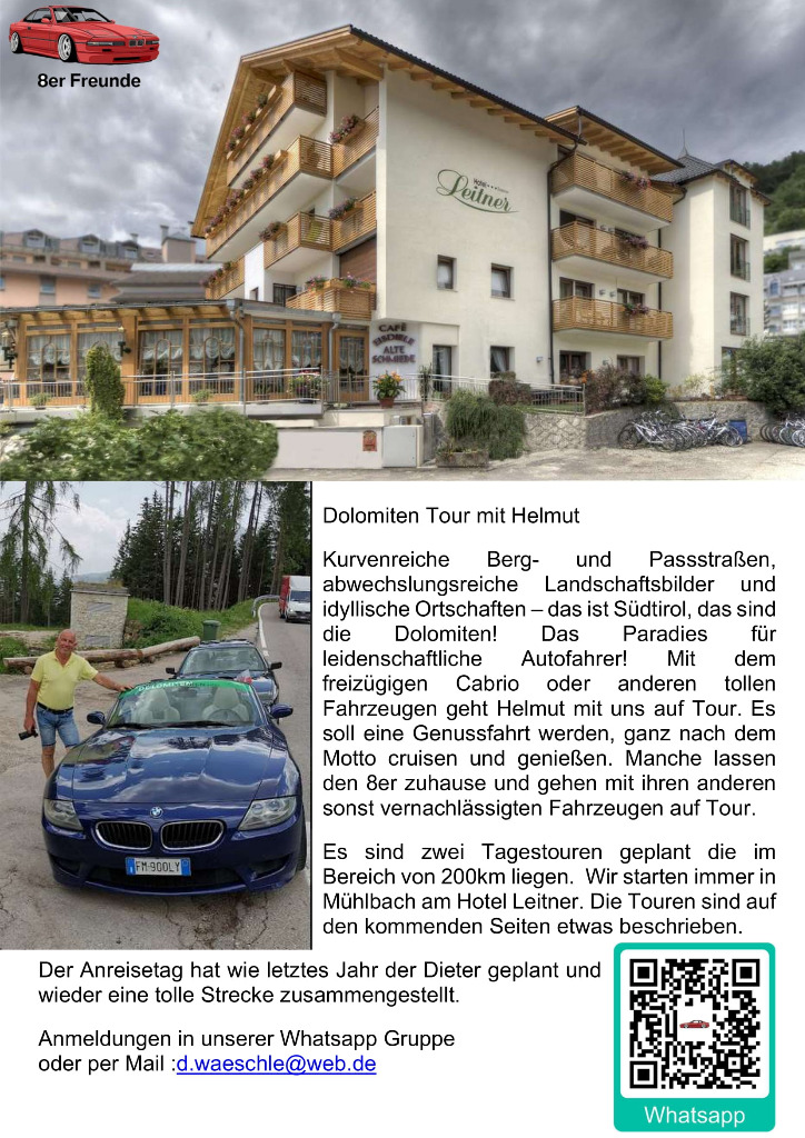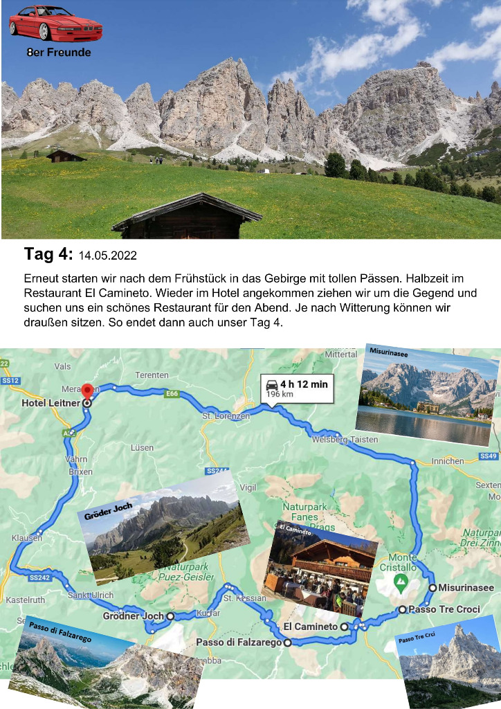 unsere Planung für die Dolomiten Tour 2022 ist fertig. Wer mit mag, einfach melden. Egal mit welchem Auto. wir haben diesesmal den Schwerpunkt Cabrio's... Auch ist die Tour auf max. 10 Fahrzeuge geplant. Soviele Zimmer sind halt geblockt. Sollten es mehr werden, versuchen wir nachzubuchen. Es wird sich dan schon eine Lösung finden...